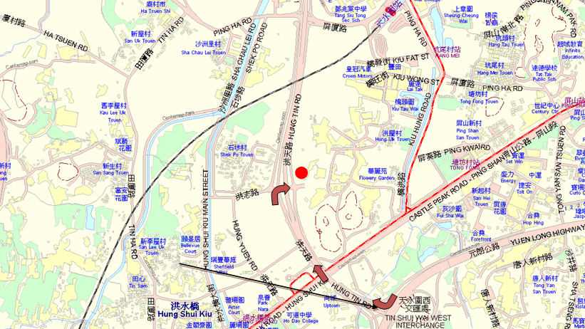元朗公路--直到-->天水圍西交匯處【EXIT出15】-->洪天路【洪水橋方向】-->